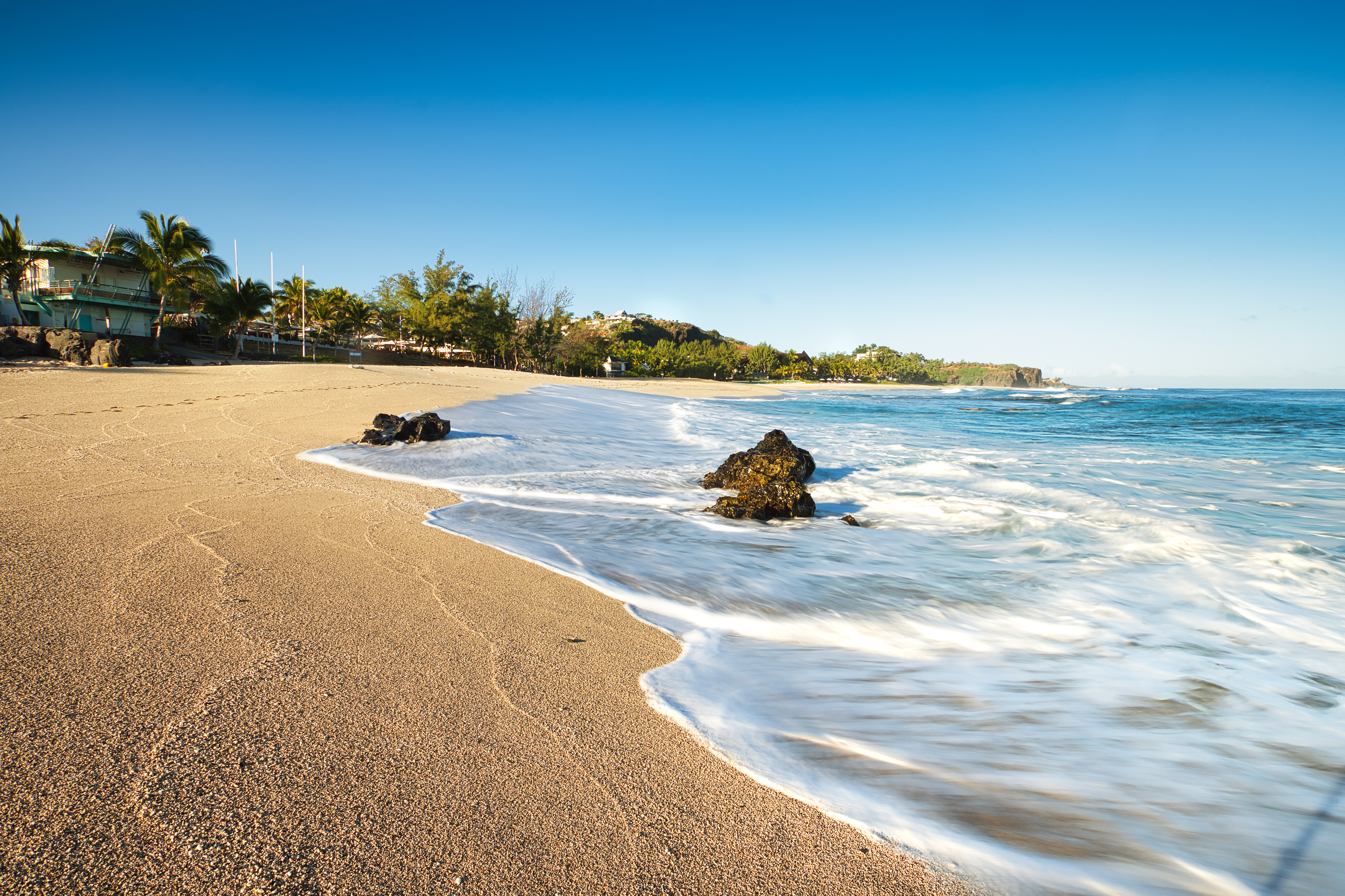 Wellen rollen über den goldenen Sandstrand von Saint-Gilles-les-Bains auf der Insel La Réunion, umgeben von Palmen und Küstenlandschaft unter klarem, blauem Himmel.